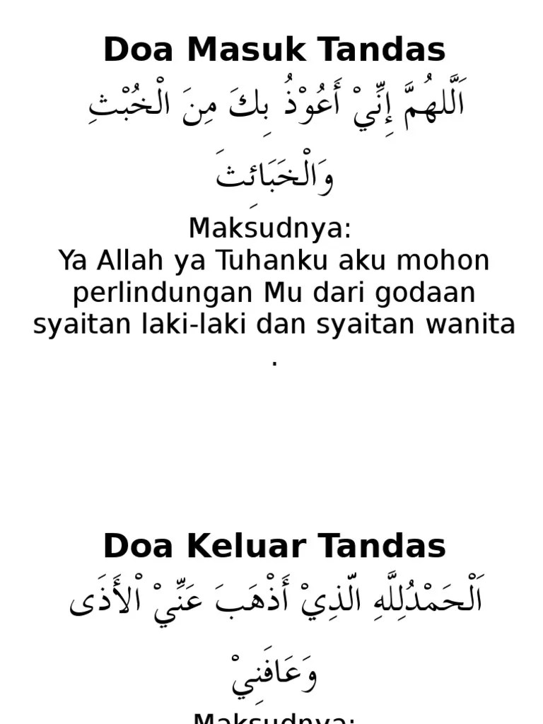 Tandas merupakan tempat tumpuan bagi syaitan. Alhamdulillaahil ladzii adzhaba 'annjil adzaa wa'aafaanii. Disertakan juga bacaan dalam rumi dan maksud bacaan doa. Recommended · doa masuk & keluar tandas.